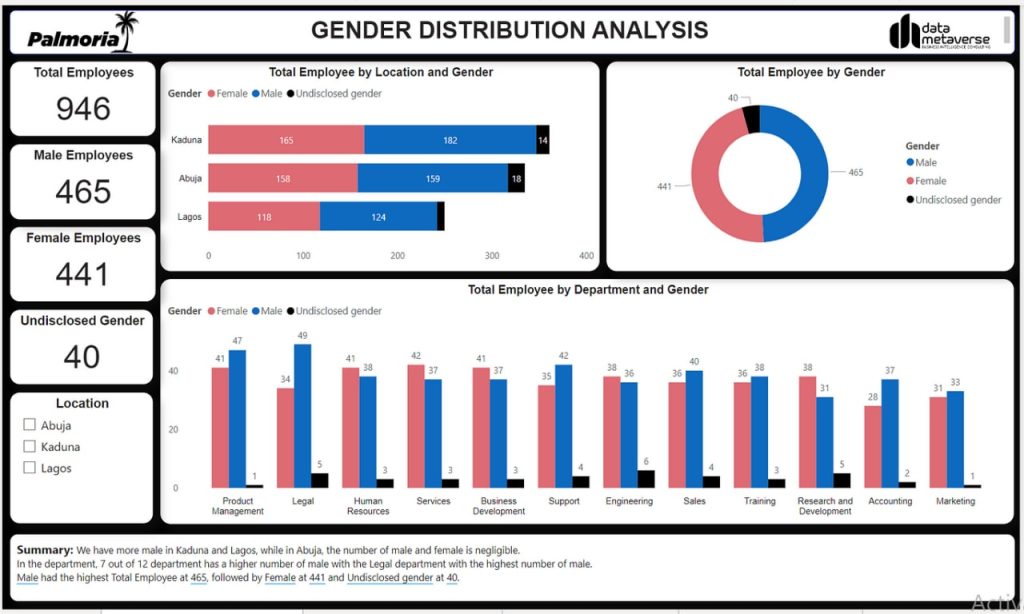 - Although there is a little gender gap in every location, it is most noticeable in the Lagos and Kaduna offices.