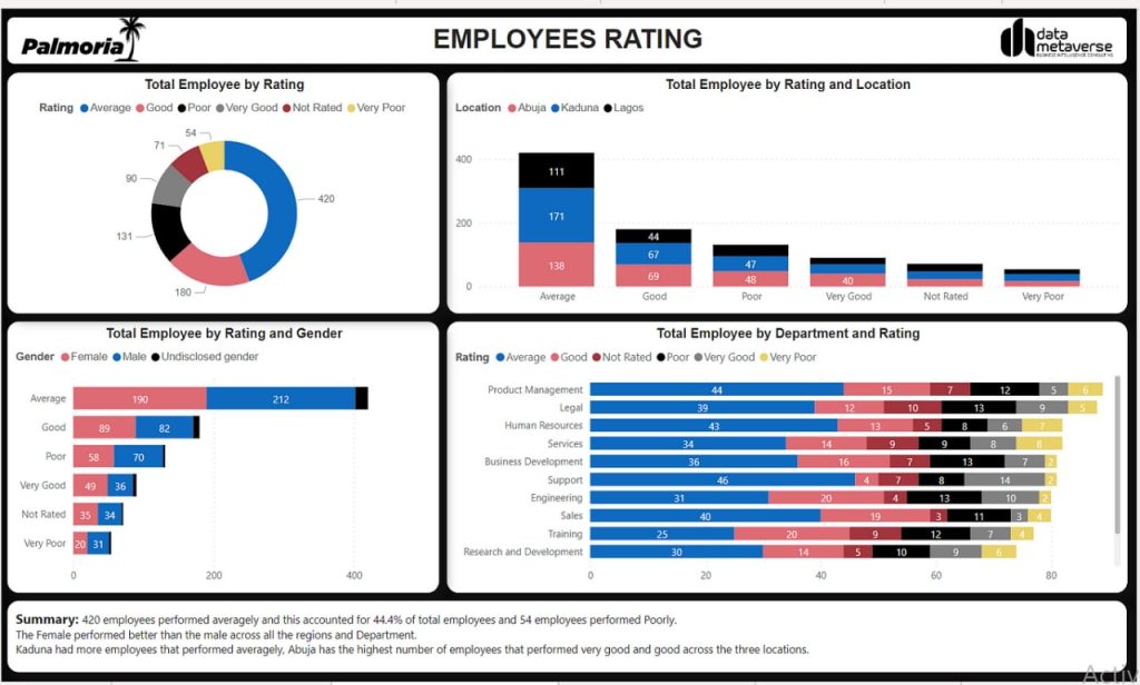 - The highest number of employees (420) performed averagely while a total of 54 employees performed poorly.