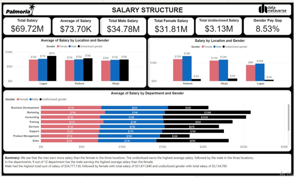 - In nine out of the twelve departments, male employees received higher salaries on an average scale.
