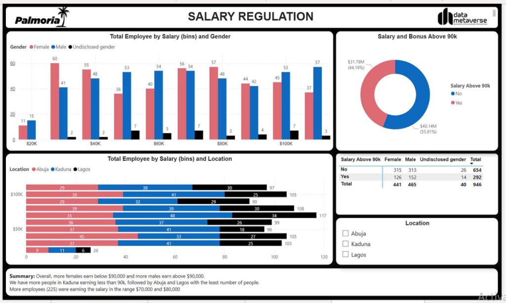 - Palmoria has not met the minimum wage requirement of $90,000 according to the manufacturing regulation with 654 (69%) employees earning less than $90,000 with an average salary of $73,700