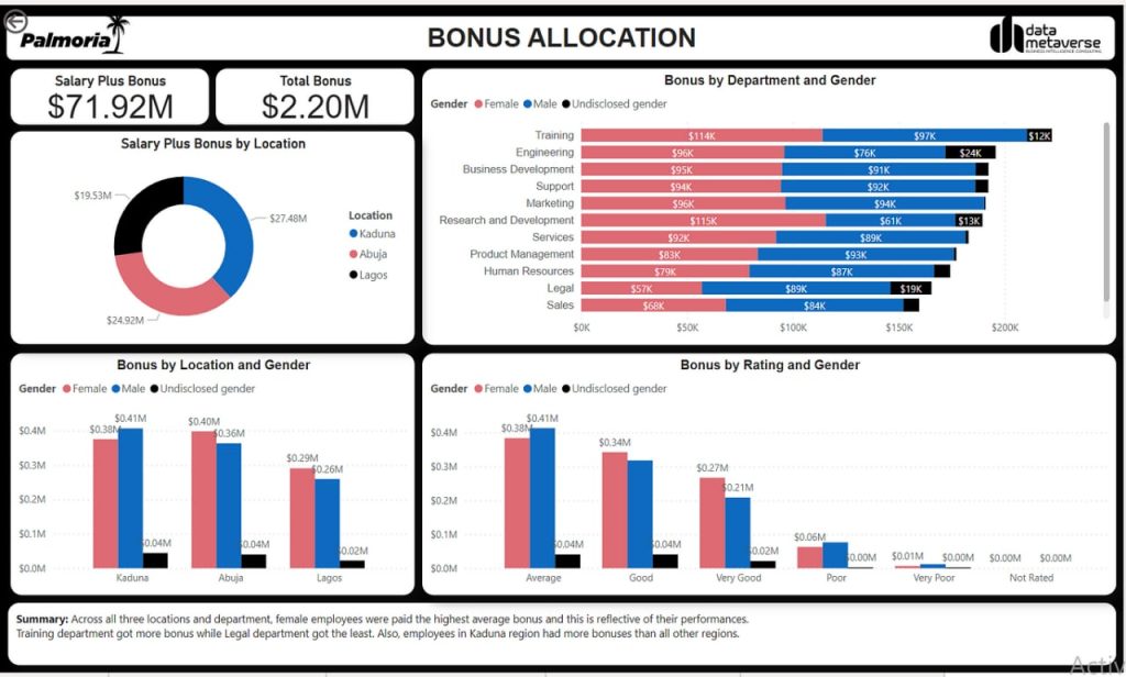 - Female employees performed better overall throughout the departments and regions which is reflected in higher overall bonuses.