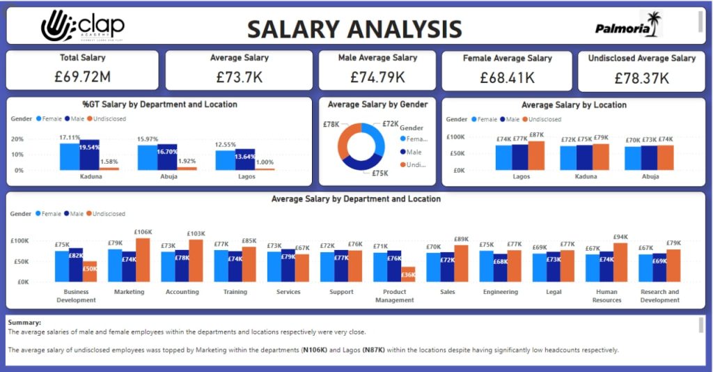The result showed a narrow gender pay gap within regions as average salary among males and females were nearly at par; highest was £77K (male, Lagos) and lowest £70K (female, Abuja). Undisclosed in Lagos was the peak (£87K) of salaries. Departments males’ TOPN3 were £82K, £79K and £78K and females, £79K, £77K and £75K, these were quite close. Undisclosed’s TOPN3, £106K, £102K and £94K were unusually high suggesting they could be contractors or subject matter experts. Overall, there was no conclusive evidence to confirm the existence of a substantial pay gap between the males and females within the regions and departments.