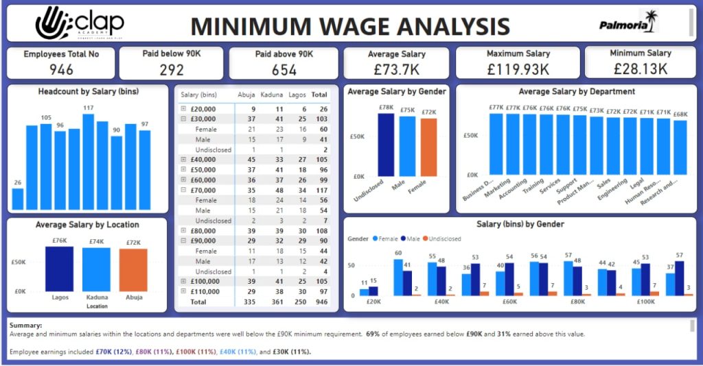 The total bonuses paid to employees and company-wide, £2,199,279.3 increased the total salary by 0.99% from £69,723,670 to £71,922,949.3 suggesting an insignificant effect or increment. In Lagos total salary was £18,954,570, bonus was £572,223.31 resulting in a new total salary, £19,526,793.31. In Abuja, total salary was £24,116,280, bonus was £801,144.21 producing a new total salary, £24,917,424.21. Kaduna’s total salary, £26,652,820 plus a bonus, £825,911.78 resulted in a new total salary £27,478,731.78. Bonuses paid to individual employees were quite low compared with their previous salaries and did not influence the pay gap considerably enough to achieve the minimum requirement. Despite added bonuses, Palmoria did to meet the £90K minimum requirement per region and company-wide.